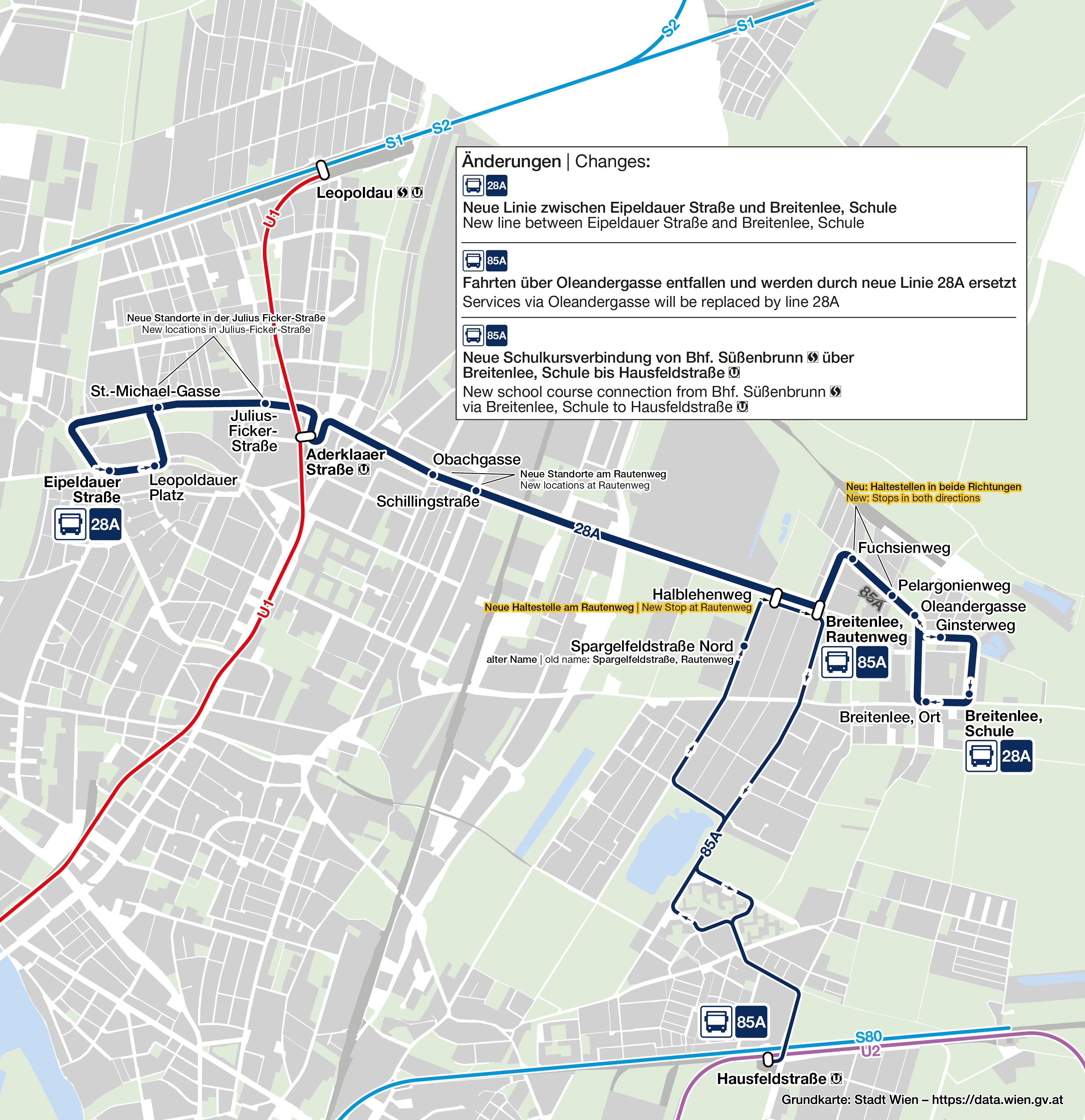 Ebenfalls ab 2. September wird die neue Bustangente zwischen Floridsdorf und Donaustadt in Betrieb genommen. Die Busse der neuen Linie 28A fahren künftig zwischen den Stationen Eipeldauer Straße im 21. und Breitenlee im 22. Bezirk. Ein Umstieg in die U1 ist künftig bei der Station Aderklaaer Straße möglich.
