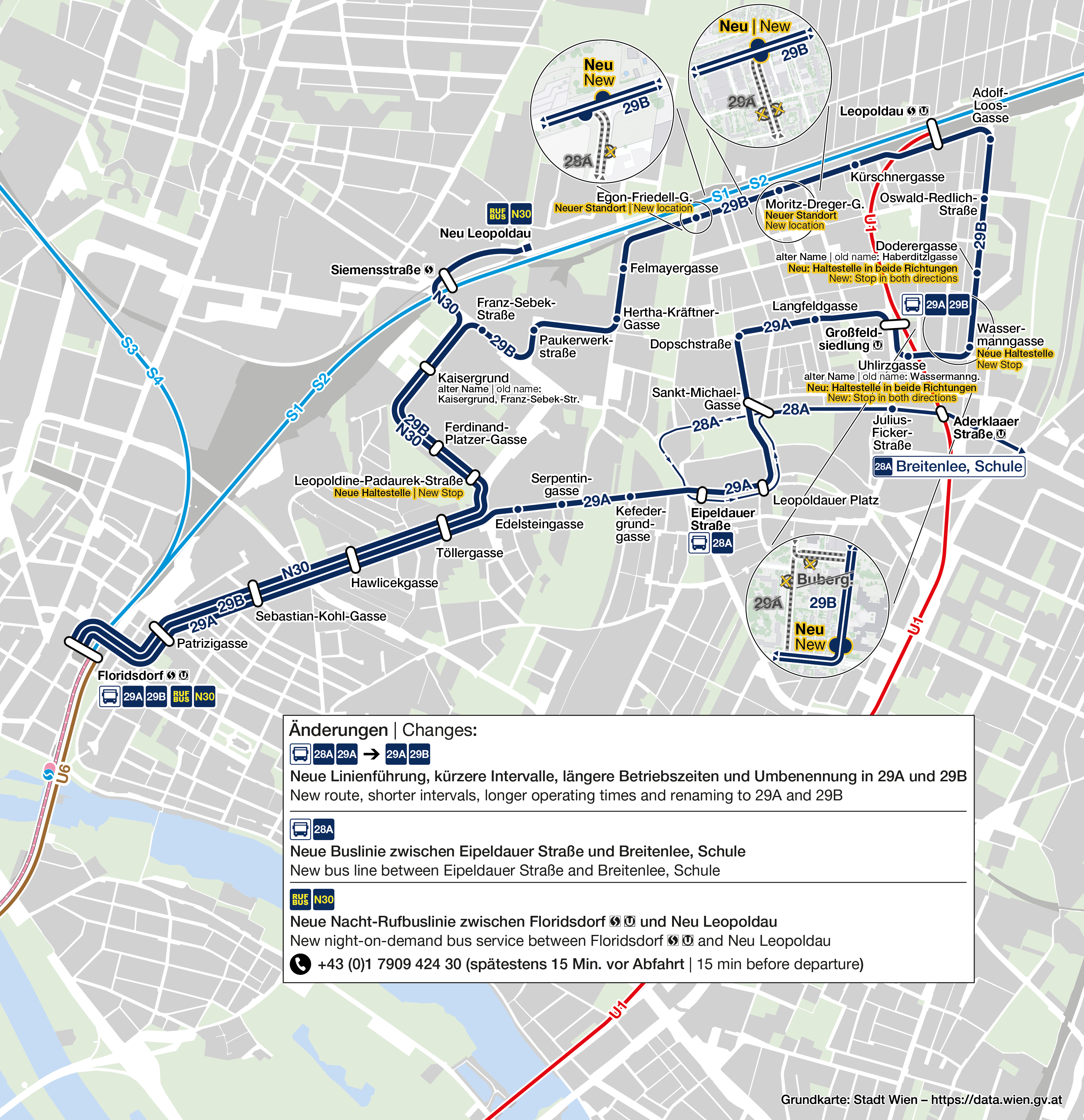 Die Verbindung zwischen den U-Bahn-Stationen Floridsdorf (U6) und Großfeldsiedlung (U1) wird neu aufgestellt. Dafür wird die Linie 29A neu organisiert und künftig mit der neuen Linie 29B eng abgestimmt. Die Linie 29B übernimmt große Teile des bisherigen 28A. Die neuen Linien werden mit Gelenkbussen betrieben. Für die Fahrgäste beispielsweise im Stadtentwicklungsgebiet „Am Park“ bedeuten diese Maßnahmen kürzere Intervalle und längere Betriebszeiten sowie Betrieb auch am Wochenende und an Feiertagen.