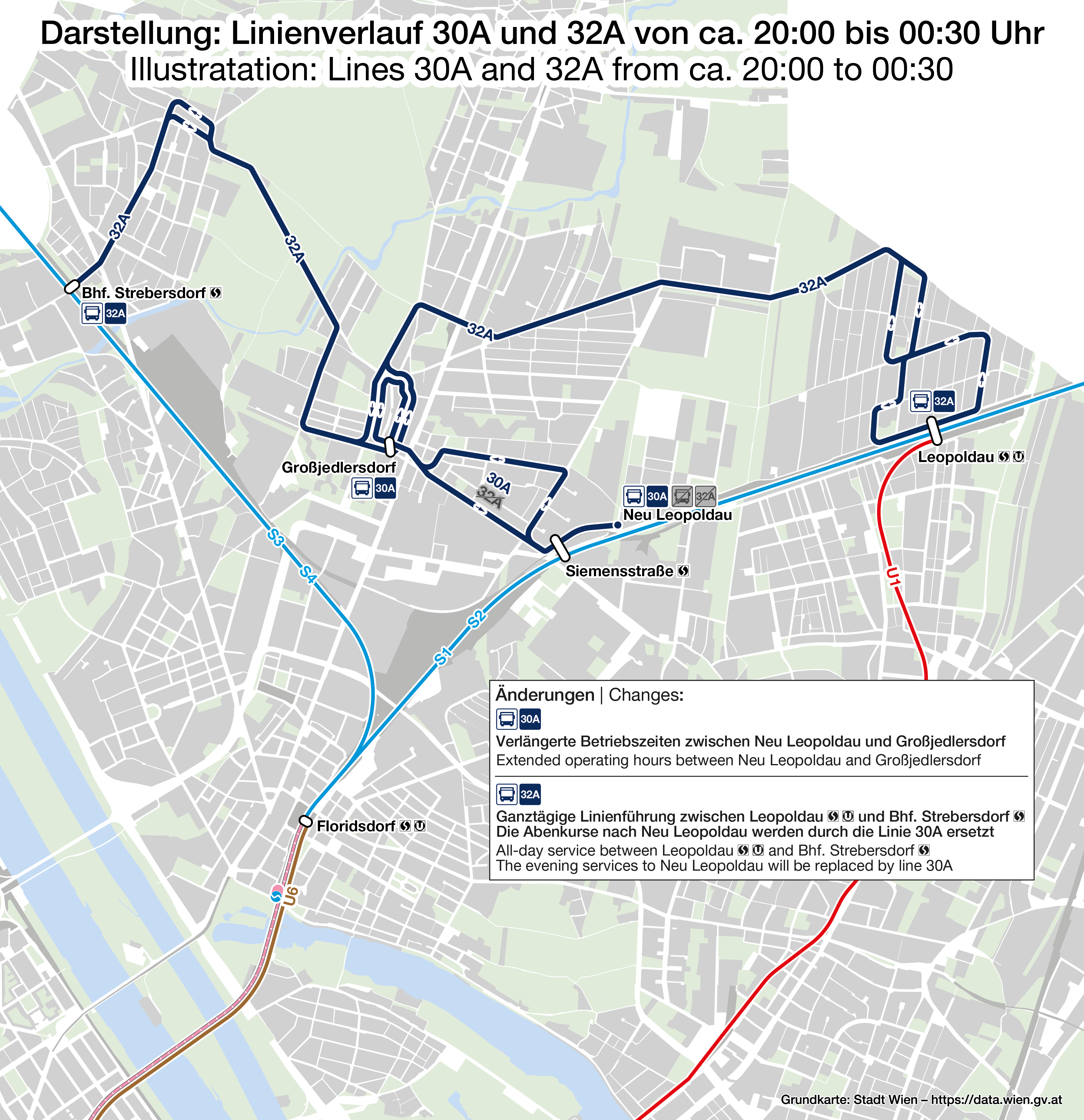 Zwischen Neu Leopoldau und Großjedlersdorf fahren künftig auch in den Abendstunden bis ca. 00:30 Uhr Busse der Linie 30A als Ersatz für die Linie 32A. Tagsüber sind diese wie gewohnt zwischen Neu Leopoldau und Freiheitsplatz unterwegs.