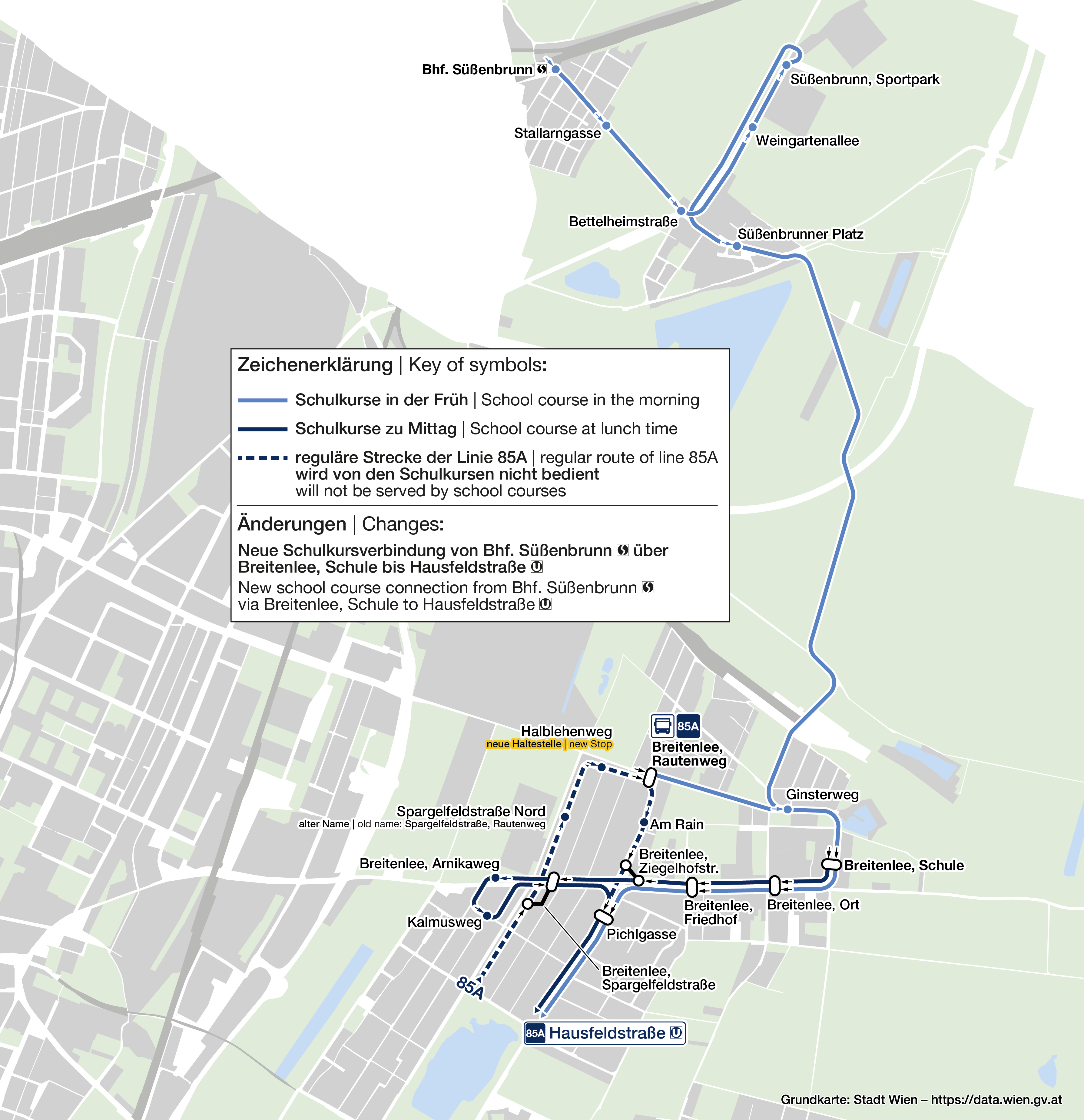 - Die bisherige Haltestelle Fuchsienweg der Linie 85A wird auch in Fahrtrichtung Breitenlee, Schule auf Höhe Pelargonienweg 26-28 eingehalten. Die Linie 85A fährt keine Kurse mehr über die Haltestelle Fuchsienweg.
