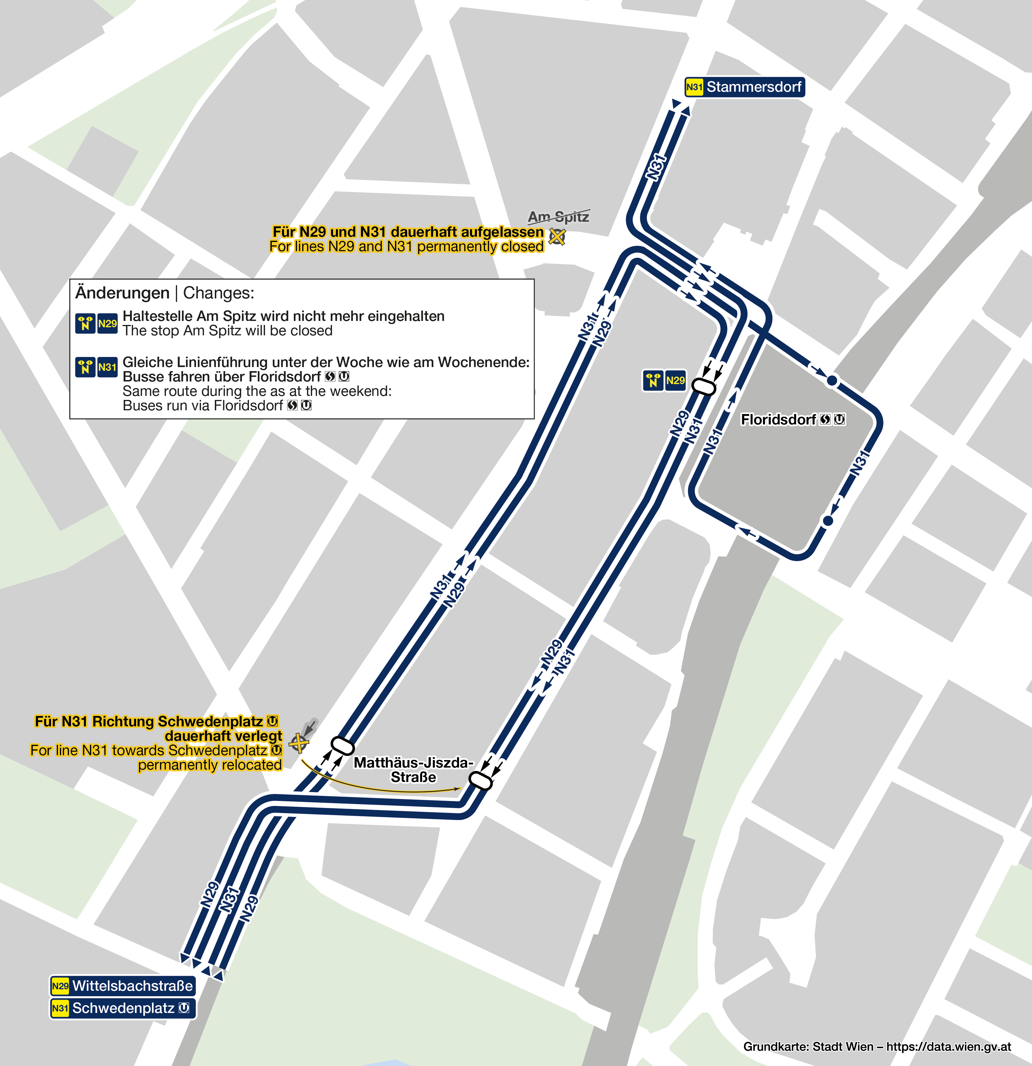 - Die Haltestelle Matthäus-Jiszda-Straße in der Floridsdorfer Hauptstraße in Fahrtrichtung Schwedenplatz wird dauerhaft aufgelassen. Stattdessen hält die Linie N31 die Haltestelle in der Matthäus-Jiszda-Straße ein.